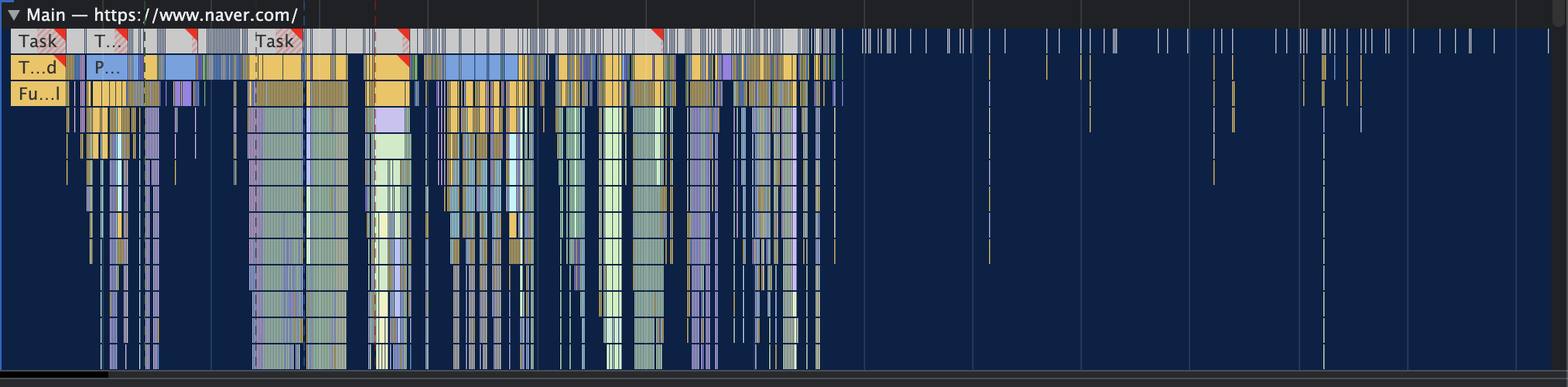 브라우저의 메인 스레드에서 실행된느 작업을 플레임 차트(Flame Chart)로 보여 줍니다. X축은 시간의 경과를, Y축은 콜 스택을 의미합니다. 위에 있는 작업이 아래에 있는 작업을 호출했다고 보시면 됩니다.
