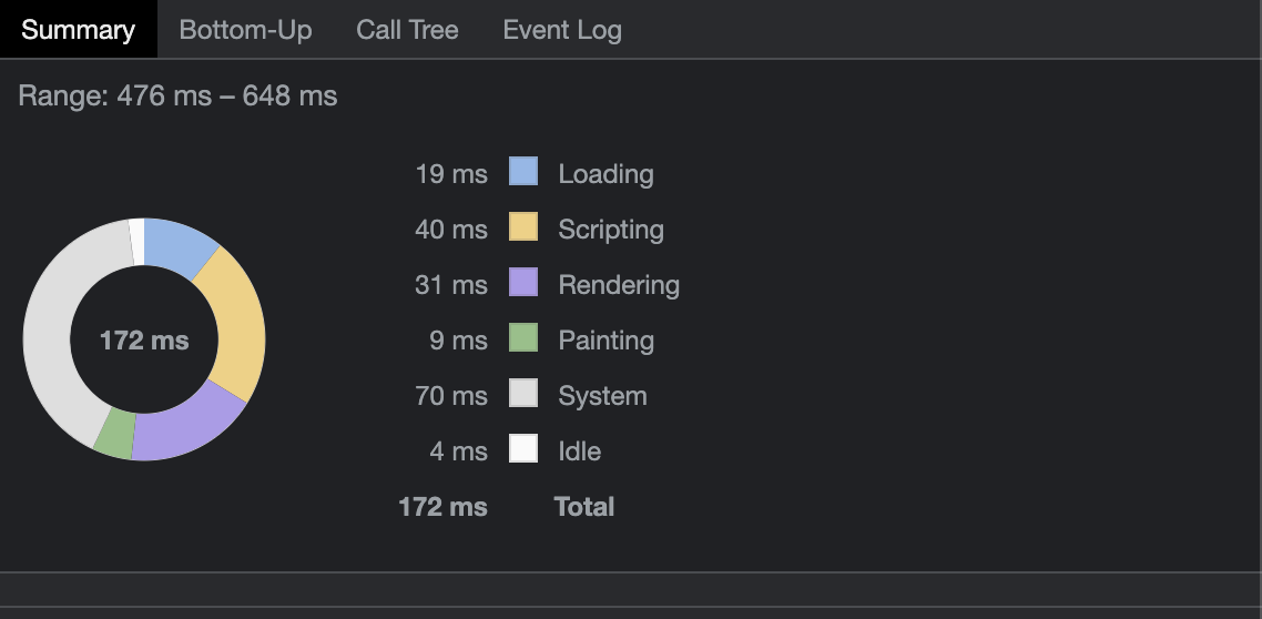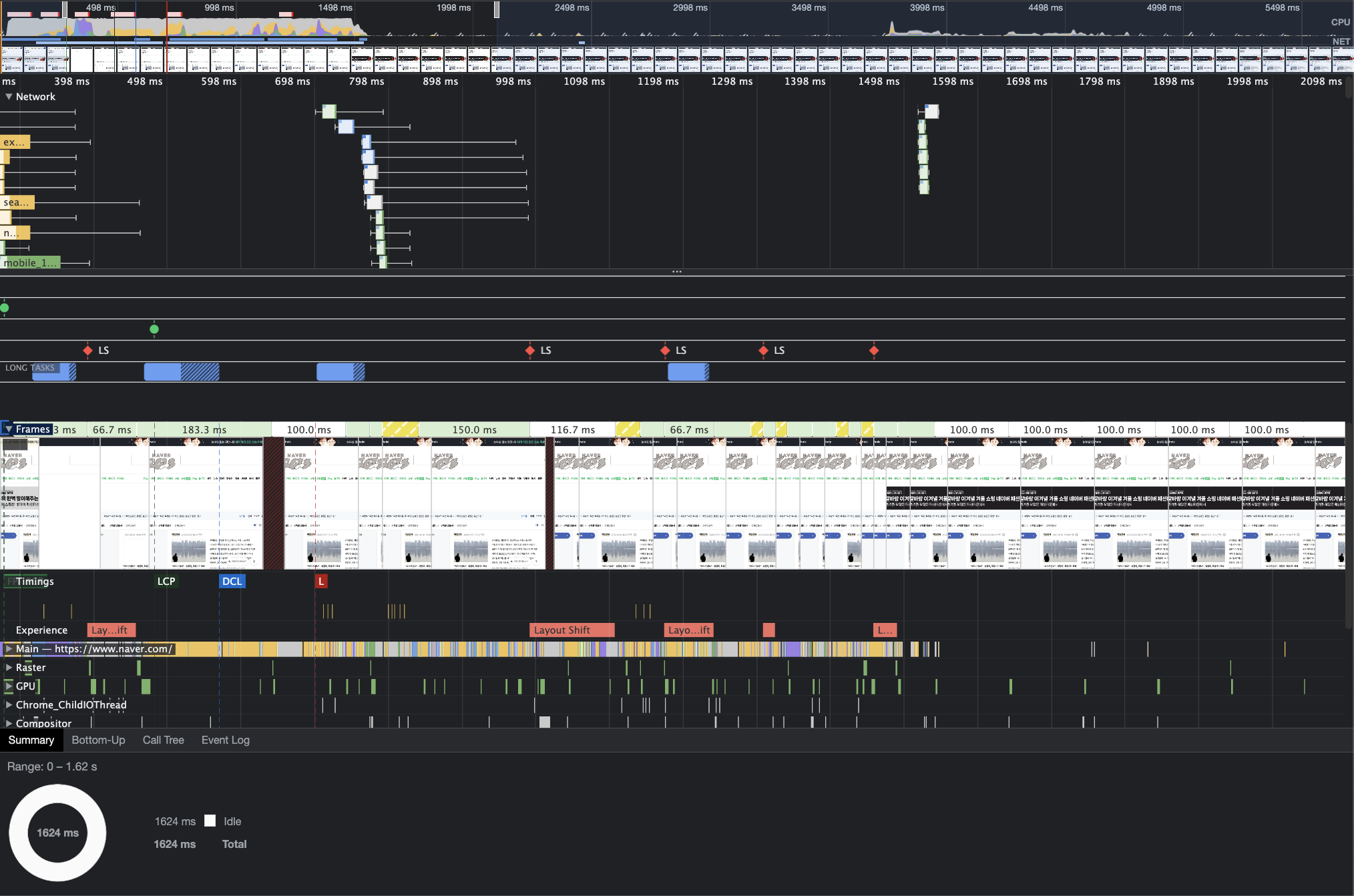 최상단에 있는 CPU 차트는 시간에 따라 CPU가 어떤 작업에 리소스를 사용하고 있는지를 비율로 보여 줍니다. 스크립트 실행 작업은 노란색, 렌더링작업은 보라색, 페인팅 작업은 초록색, 기타 작업은 회색으로 표시됩니다. 이 차트를 통해 어느 타이밍에 어떤 작업이 주로 진행되고 있는지 파악 할 수 있습니다. 위에 빨간색 선은 병목 현상을 나타냅니다. 그 아래는 네트워크 차트로, 대략적인 네트워크 상태를 보여줍니다. 위쪽에 진한 막대는 우선순위가 높은 리소스를, 아래 쪽의 옅은 막대는 우선순위가 낮은 네트워크 리소스를 보여줍니다. 그 아래에는 스크린 샷으로, 서비스가 로딩되는 과정을 보여줍니다.