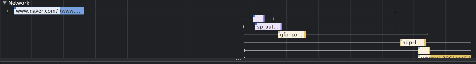 서비스 로드 과정에서의 네트워크 요청을 시간 순서에 따라 보여줍니다. 각 네트워크 요청 막대에서 의미하는 바는 다음과 같습니다.